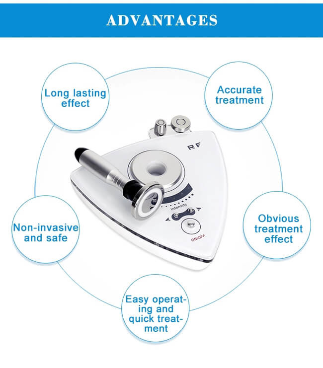 Наш прибор поставляет энергию радиочастоты на 5mhz, которое поставляет равномерное объемное тепловое действие в глубокую дерму и кладя в основу ткань. Жара произведена сопротивлением ткани естественным